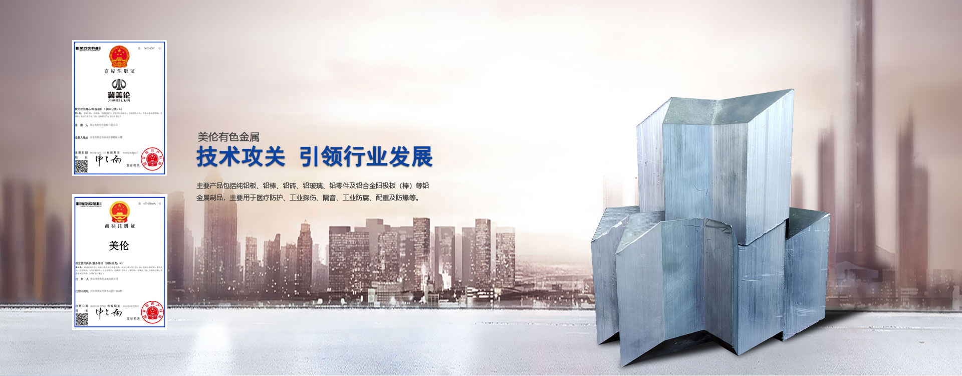 主要產品包括純鉛板、鉛棒、鉛磚、鉛玻璃、鉛零件及鉛合金陽極板(棒)等鉛金屬制品。